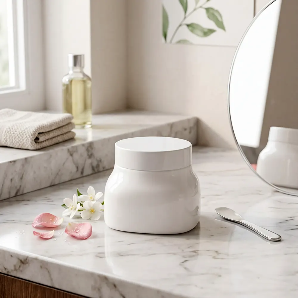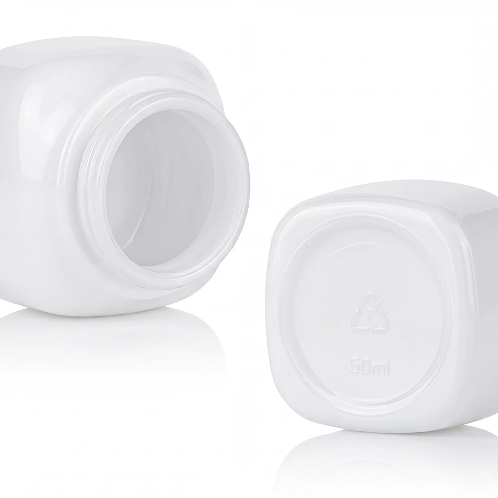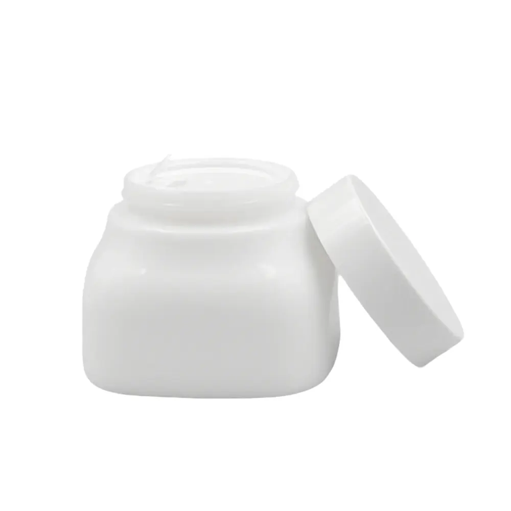 عبوات كريم الوجه باللون الأبيض اللامع بتصميم مربع منحني فريد. عبوات مستحضرات التجميل البيضاء مثالية لتغليف منتجات العناية بالبشرة الفاخرة. شحن سريع للطلبات الدولية.