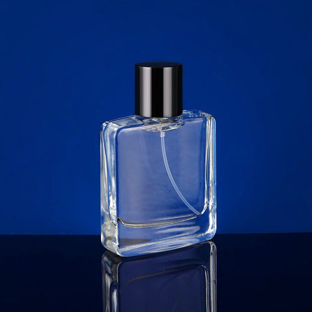 Тези празни флакони за парфюми са специално разработени за марки, преследващи високо качество. Бутилката е изработена от висококачествено кристално стъкло и има леко скосен правоъгълен дизайн с изчистени линии. Цялостната визия е семпла и щедра и излъчва елегантност и усещане за висок клас по скромен начин. прозрачната бутилка може перфектно да покаже очарованието на цвета на парфюма или одеколона, което прави всяка капка аромат пълна с визуална привлекателност. Със синя метална капачка или матово черно капаче, той е не само универсален като стил, но и притежава уникален темперамент. Удебелената стъклена основа е стабилна и солидна и в ръката ви се усеща спокойствие и лукс, което е много подходящо за висок клас или нишови серии парфюми.