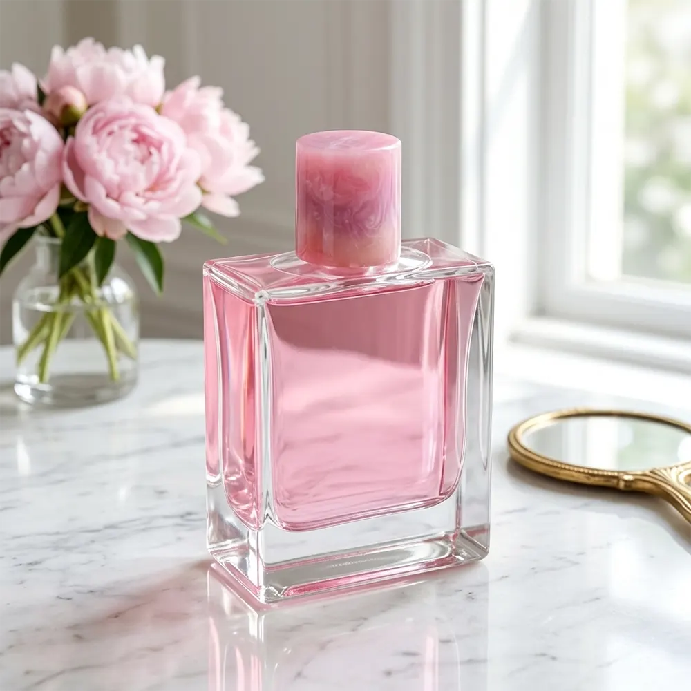 フローラル系の香りを専門とするニッチなビューティーブランドが、当社の100mlスクエア型香水ボトルを商品として採用しました。優れた透明度を誇るガラス素材と、香水が持つ芸術的な外観を際立たせる、明るさと豪華さを兼ね備えたベースデザインが選ばれました。また、ボトルデザインと調和する、特徴的な「ローズクォーツ」大理石模様のカスタムキャップデザインも依頼されました。