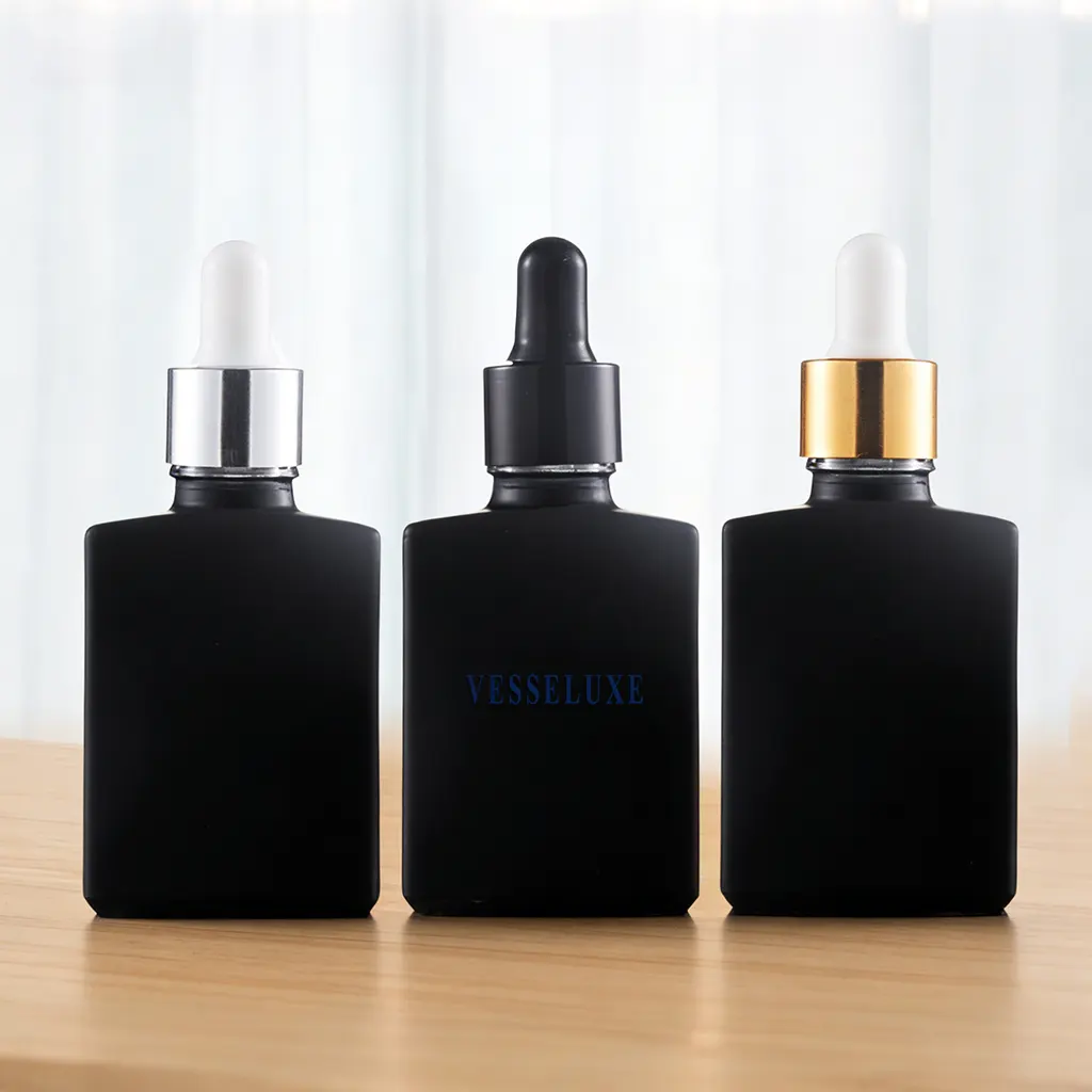 30ml matte black dropper bottle with UV protection and metallic collar. Ideal for essential oils, serums, and premium skincare packaging.