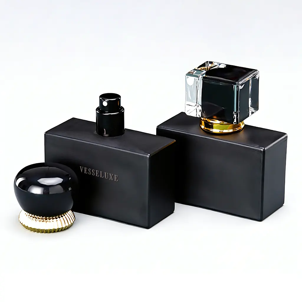 Şık siyah ve altın renkli parfüm şişesi tasarımıyla, toptan olarak satılan birinci sınıf 50 ml'lik parfüm şişeleri. Lüks parfüm ambalajı ve özel marka çalışmaları için idealdir.