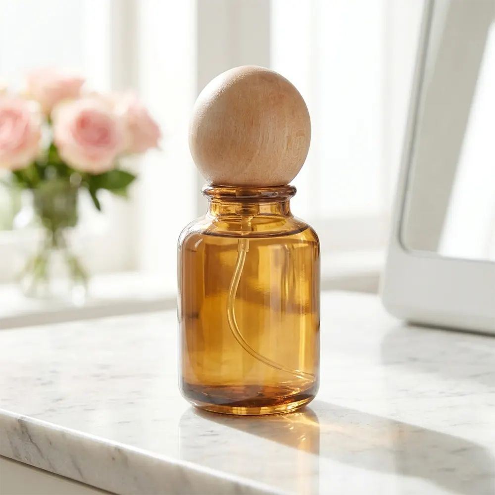 Bu özel kolonya şişeleri, dairesel tabanından yuvarlak omuz tasarımıyla boynuna kadar uzanan akıcı bir gövdeye sahiptir. Şişenin cam malzemesi, ışığa duyarlı kokuları zararlı etkilerden koruyan sıcak, yarı saydam bir kehribar rengi sergiler. Kahverengi kolonya şişesi, yuvarlak şekilli benzersiz bir ahşap tıpa ile tamamlanmıştır; doğal damar deseni tasarıma doğal bir güzellik katar ve el yapımı veya özel kokuları saklamak için mükemmeldir.
